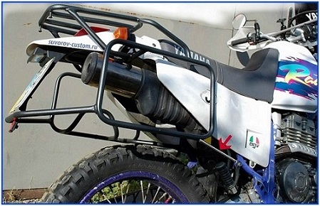 На фото слева показан багажник, который продаётся в некоторых интернет магазинах и рассчитан для внедорожных мотоциклов. Такой багажник для мотоцикла Ямаха стоит 170$ плюс доставка. Однако багажник подобного типа совсем несложно изготовить самостоятельно, и не только для мотоцикла Ямаха, а для любого байка. Только лишь крепёжные элементы делаются в зависимости от конфигурации рамы, седла и заднего крыла вашего байка.