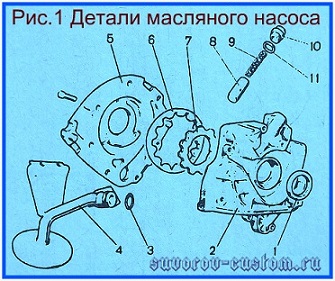 1 — передний сальник коленвала, 2 — крышка масляного насоса, 3 — резиновое уплотнительное колечко, 4 — трубка маслоприёмника, 5 — корпус насоса, 6 — ведомая шестерня, 7 — ведущая шестерня, 8 — редукционный клапан, 9 — пружинка редукционного клапана, 10 — пробка насоса, 11 — уплотнительное кольцо пробки.