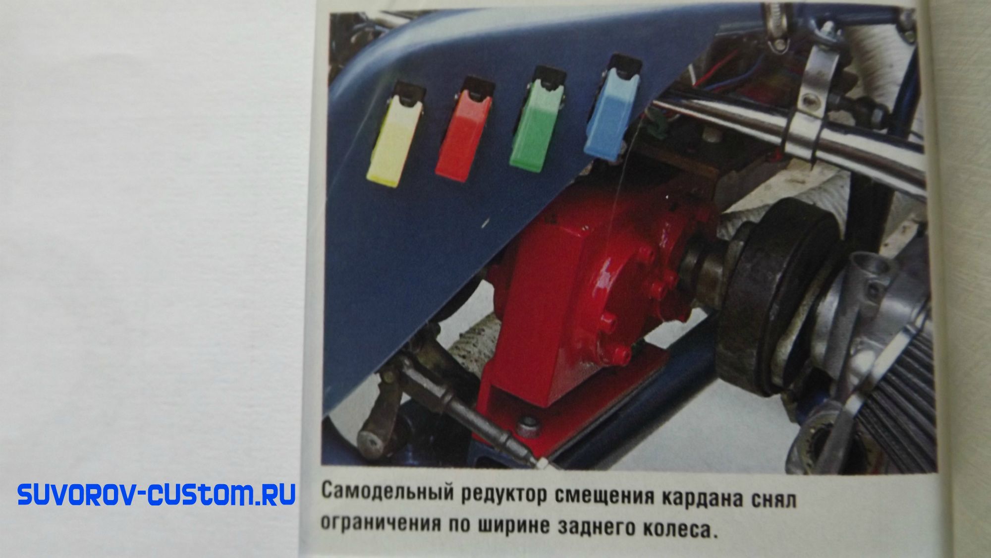 Карданный привод. Здесь сдвинуть в сторону карданный вал можно с помощью цепного или шестерёнчатого редуктора необходимой ширины. Причем можно изготовить угловой редуктор (валы с коническими шестернями, стоящие под 90 градусов) с переходом на цепной привод заднего колеса(см. фото). И стандартный опозитный Урал или Днепр будет уже цепным мотоциклом и на нем можно будет менять звёздочки, в зависимости от необходимой скорости. В качестве такого редуктора можно использовать штатный задний мост отечественных оппозитов(см. фото). Редуктор «съест» пару процентов мощности, но ведь согласитесь для чоппера это не важно, для него главное это стильный внешний вид. Главное в этих изменениях, это опять же строгая перпендикулярность вала ведущей звёздочки редуктора и оси заднего колеса и паралельность обоих звёздочек : ведущей и ведомой.