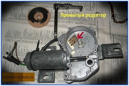 После вскрытия редуктора, промываем все детали керосином или дизельным топливом и внимательно осматриваем на предмет износа. Обычно концевик перестаёт выключать редуктор (дворники останавливаются где попало) от износа контакта, скользящего по диску — то есть изношенный контакт перестаёт касаться поверхности контактного диска и электрический контакт этих деталей пропадает.