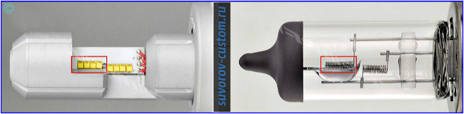 Ну и самое главное: учтите, что рефлекторы ваших фар рассчитаны на галогенки, которые имеют спирали. Поэтому не покупайте лампы, в которых установлены светодиоды больших размеров. Чем светодиод больше спирали, тем не правильнее будет фокусировка света в фарах (чем меньше светодиод по размерам, при равных показателях мощности в люменах, тем он дороже и качественнее). В идеале покупайте лампы с размером светодиода как у спирали( см. фото чуть ниже.